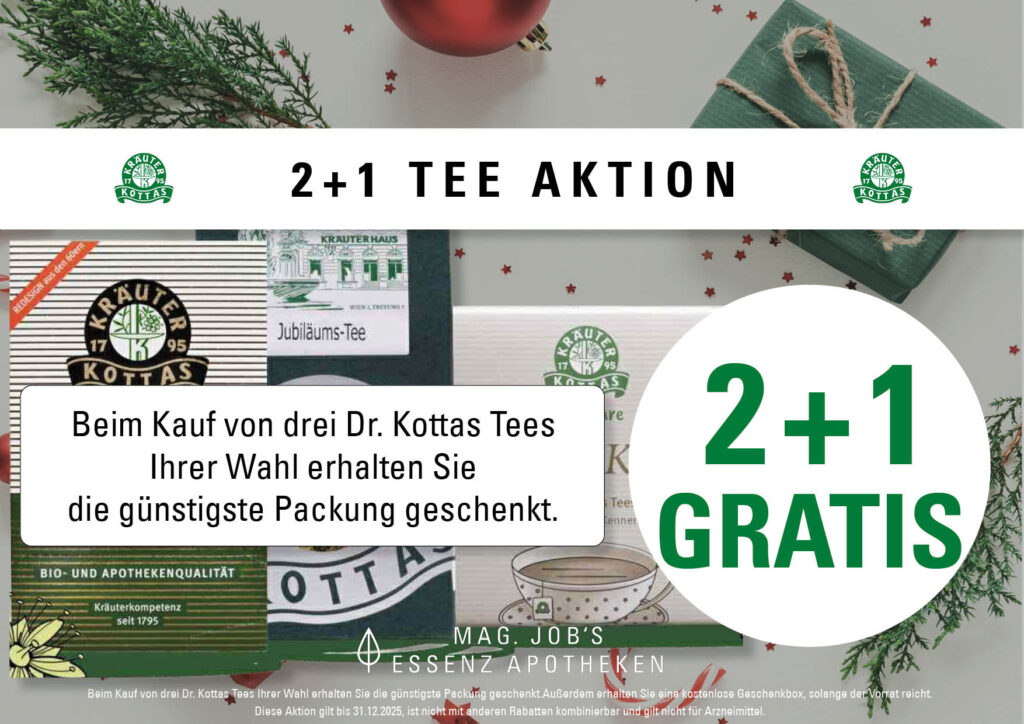 Beim Kauf von drei Dr. Kottas Tees Ihrer Wahl erhalten Sie die günstigste Packung geschenkt.